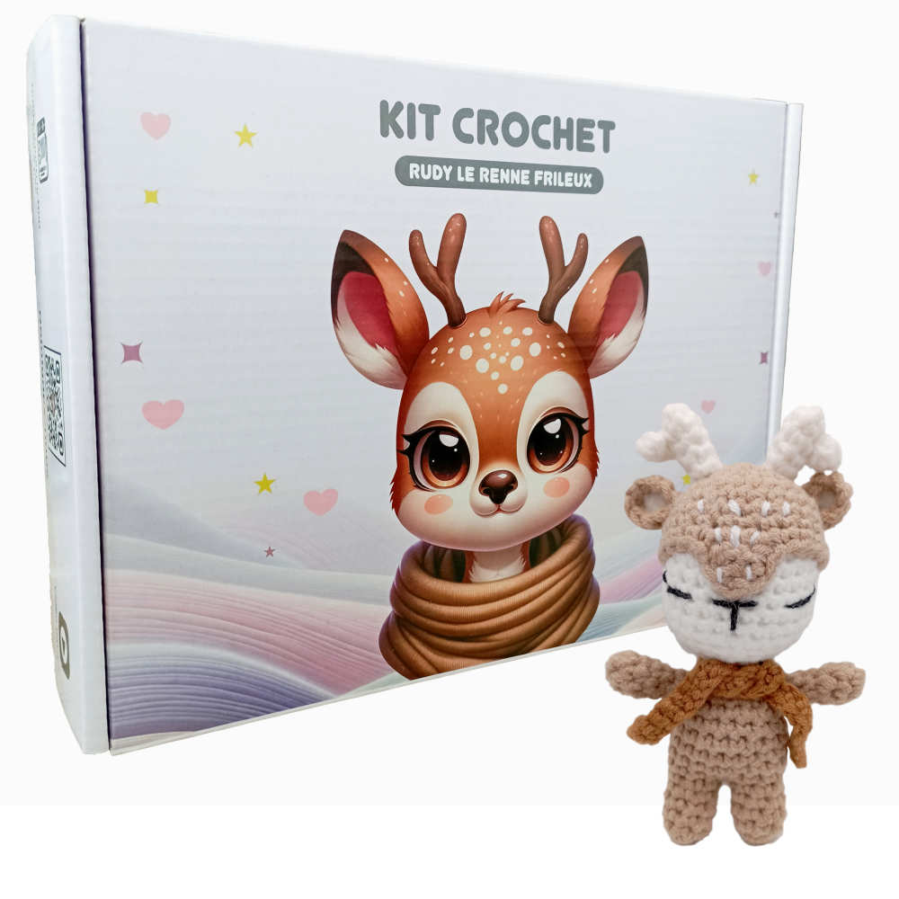 "Un kit complet pour faire au crochet Rudy le Renne. Il y a tout : le crochet, la laine et la bourre. Il y a un QR code pour apprendre le crochet et un autre pour faire le renne."